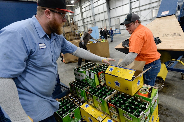 (Francisco Kjolseth | The Salt Lake Tribune) Operators Braeden Adamson, left, and Jayson Dlugas drop beer bottles into a glass recycler as the DABC delivers 275 cases of beer on three pallets to the new food digester in North Salt Lake on Friday, Dec. 13, 2019. The state can no longer sell the beer — all between 4% and 5% ABV — because it can't compete with privately-owned grocery and convenience stores which started selling the higher alcohol brews on Nov. 1.