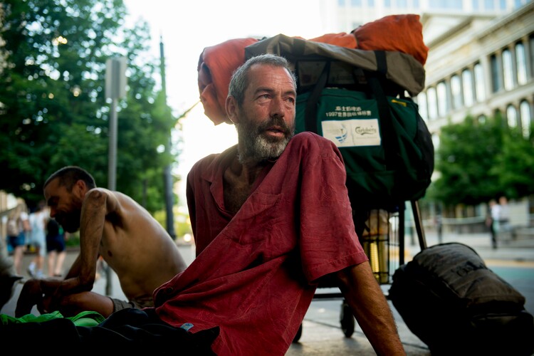 (Jeremy Harmon | The Salt Lake Tribune) Chris Coons, right, and Emil Miller sit on the sidewalk outside City Creek Mall in Salt Lake City on July 11, 2019.