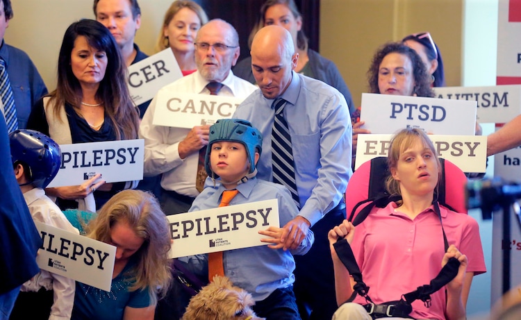 (Rick Bowmer | AP file photo) Davis Cromar, center, holds his son Holden, 10, who suffers from epilepsy, while standing with other patients, caregivers and supporters during the Utah Patients Coalition news conference, in Salt Lake City on June 26, 2017.