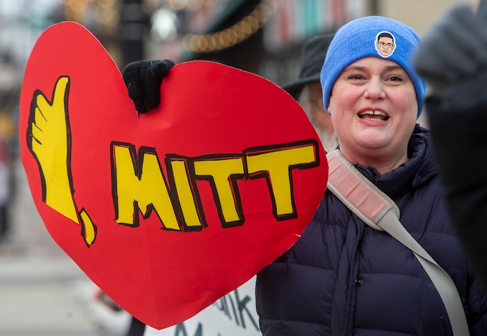 (Francisco Kjolseth | The Salt Lake Tribune) Caroline Phinney joins others gathered in support of Sen. Mitt Romney, R-Utah, at the Wallace F. Bennett Federal Building in Salt Lake City on Wednesday, Feb. 5, 2020, after he voted to convict President Donald Trump of abuse of power. The Utah senator was the only Republican to vote guilty on the first article of impeachment.