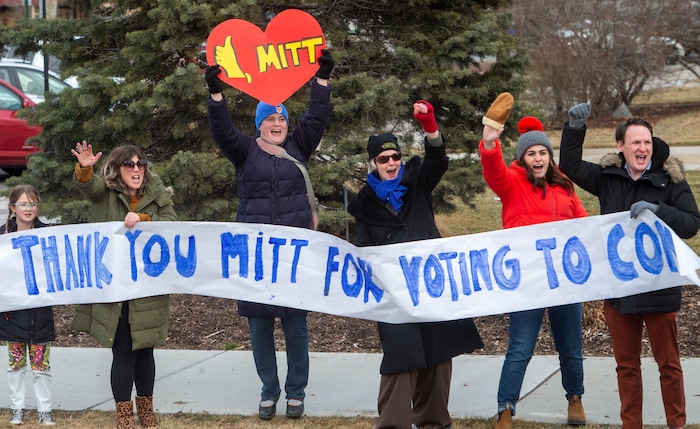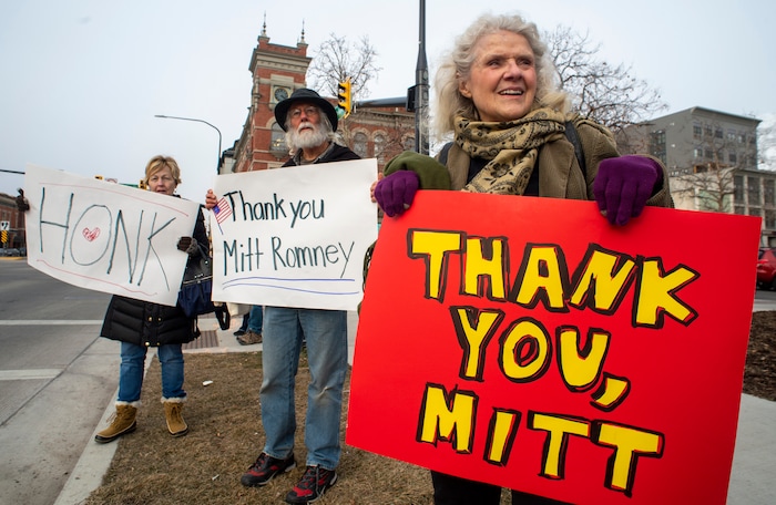 More than 50 people showed up in sub-freezing temperatures Wednesday in downtown Salt Lake City to thank Sen. Mitt Romney, R-Utah, for his vote to convict President Donald Trump in the Senate impeachment trial.