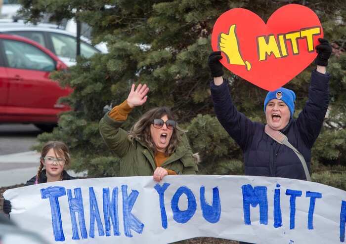 Supporters also gathered Wednesday in Provo, home to Romney’s alma mater Brigham Young University. They stood on a sidewalk facing the streets with signs saying “True Mitt," “This Mormon Mom Says Thank You, Mitt!” and simply “Thank You, Mitt.”