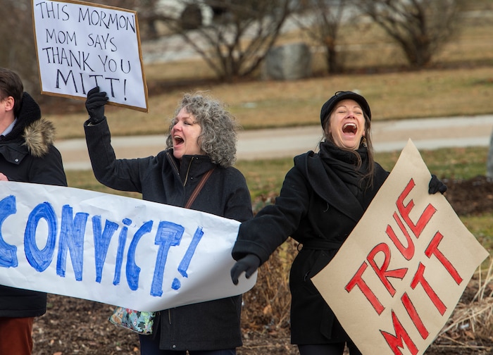 (Rick Egan | The Salt Lake Tribune) Jody England Hansen and Jennifer England cheer as cars honk to show their support during a rally on Center Street in Provo, to thank Mitt Romney for voting to convict President Trump, on article one, in the impeachment vote, Wednesday, Feb. 5, 2020.