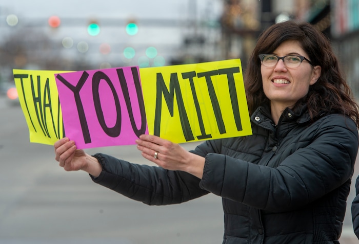 (Rick Egan | The Salt Lake Tribune) Jody England Hansen holds a sign on Center Street in Provo, during a rally, to thank Mitt Romney for voting to convict President Trump, in the impeachment vote, Wednesday, Feb. 5, 2020.