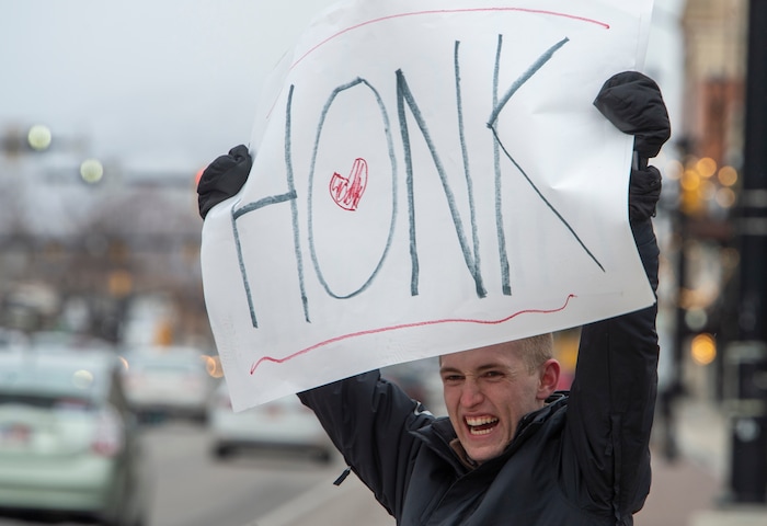 (Rick Egan | The Salt Lake Tribune) Parker Howell waves at cars on Center Street in Provo, during a rally to thank Mitt Romney for voting to convict President Trump, in the impeachment vote, Wednesday, Feb. 5, 2020.