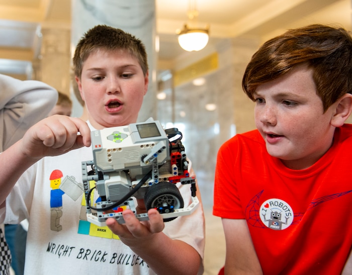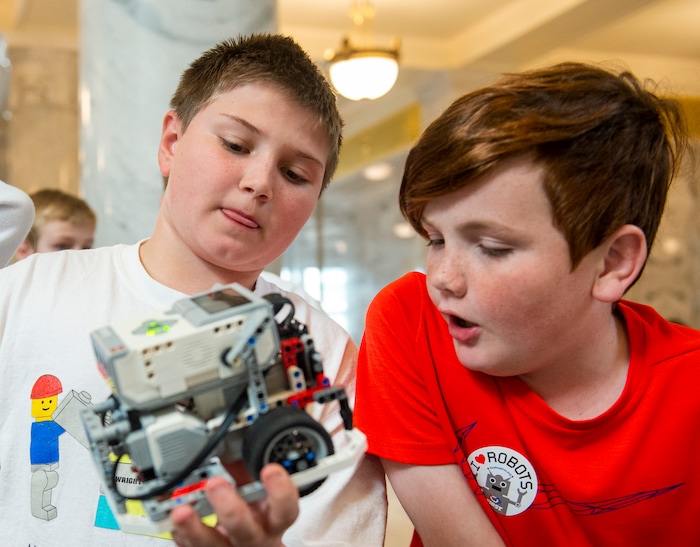 (Rick Egan | The Salt Lake Tribune) Sixth-graders Sam Mason and Carson McKendie from Gerold Wright Elementary from West Valley, work on their robots, during the FIRST Utah Robotics demonstration in the Rotunda of the State Capitol, where the public and local legislators had a chance to operate the robots and to learn more about the FIRST program and the importance of STEM education,Tuesday, Feb. 18, 2020.