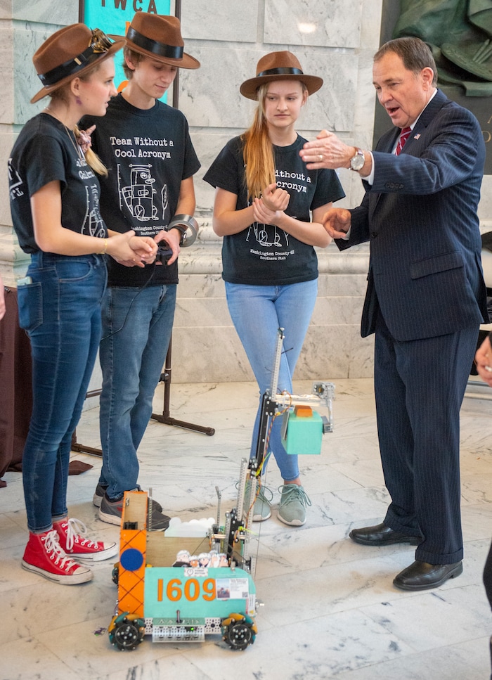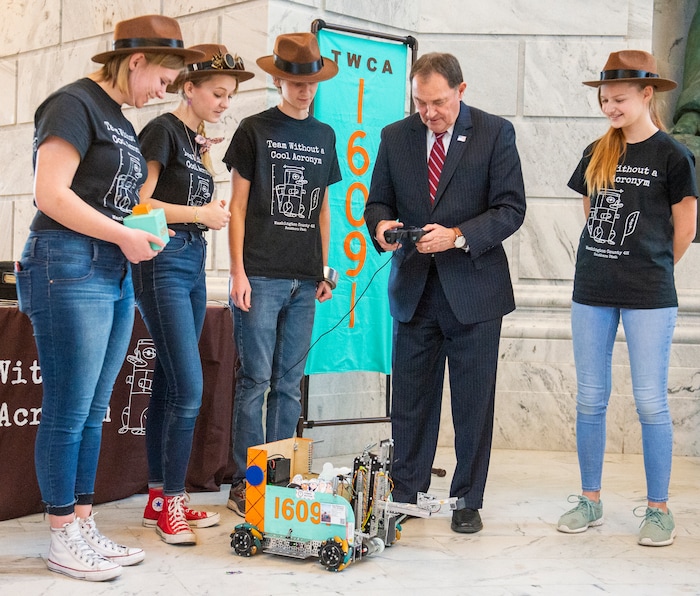 (Rick Egan | The Salt Lake Tribune) Gov. Gary Herbert talks to students from Hurricane about their robot, during the FIRST Utah Robotics demonstration in the Rotunda of the State Capitol, where the public and local legislators had a chance to operate the robots and to learn more about the FIRST program and the importance of STEM education,Tuesday, Feb. 18, 2020.