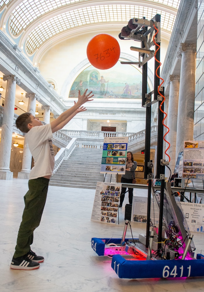 (Rick Egan | The Salt Lake Tribune) A student named Hunter catches a ball from a robot made by Jordan High students named Beetbot, during the FIRST Utah Robotics demonstration in the Rotunda of the State Capitol, where the public and local legislators had a chance to operate the robots and to learn more about the FIRST program and the importance of STEM education,Tuesday, Feb. 18, 2020.