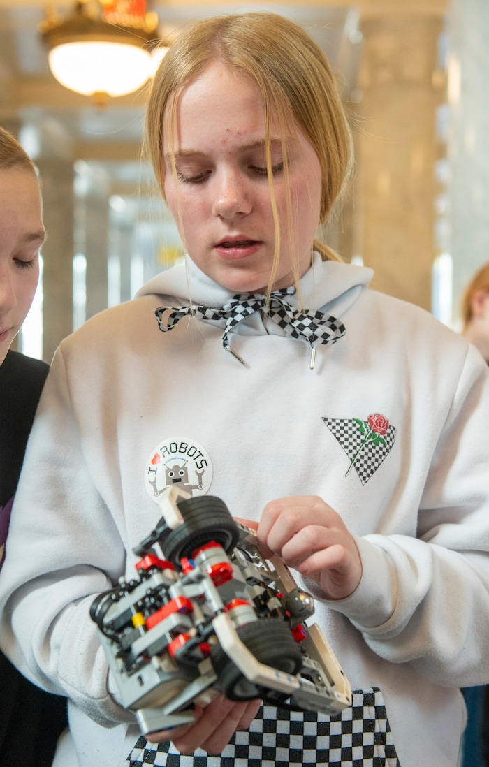 (Rick Egan | The Salt Lake Tribune) Ellsie Nelson, sixth grade, from Gerold Wright Elementary from West Valley, works on her robot, during the FIRST Utah Robotics demonstration in the Rotunda of the State Capitol, where the public and local legislators had a chance to operate the robots and to learn more about the FIRST program and the importance of STEM education,Tuesday, Feb. 18, 2020.