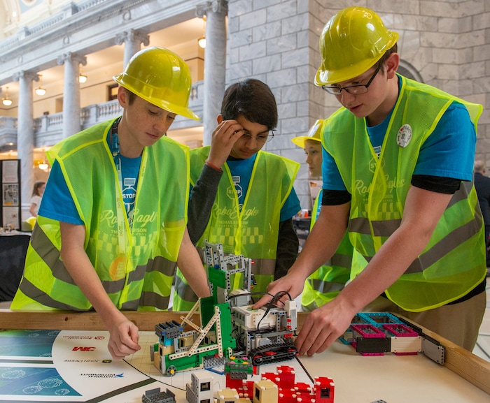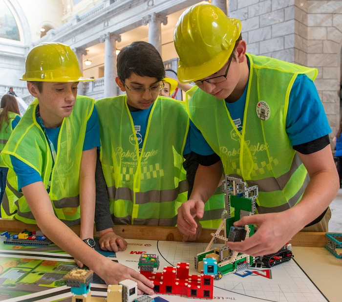 (Rick Egan | The Salt Lake Tribune) Jack Huish, Rkishan Paunkao, Frand lema, students from Thomas Edison Charter School from North Logan, work on their robots, during the FIRST Utah Robotics demonstration in the Rotunda of the State Capitol, where the public and local legislators had a chance to operate the robots and to learn more about the FIRST program and the importance of STEM education,Tuesday, Feb. 18, 2020. Thomas Edison Charter School from North Logan