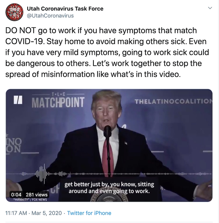 The Utah Coronavirus Task Force — headed by the lieutenant governor — said President Donald Trump “spread ... misinformation” when he suggested people could recover from COVID-19 while going to work.