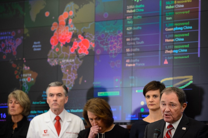 (Trent Nelson | The Salt Lake Tribune) Michael Good and Ruth Watkins a news conference in the state's Emergency Operations Center on Thursday, March 12, 2020 addressing the current state of COVID-19 in Utah. Representatives from the Utah System of Higher Education, the Utah Board of Education, Utah Jazz, local health authorities and Utah Department of Health were also present.