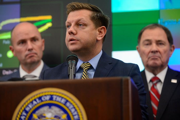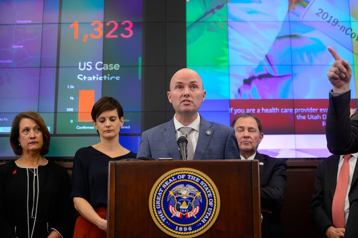 (Trent Nelson | The Salt Lake Tribune) Lt. Gov. Spencer J. Cox speaks at a news conference in the state's Emergency Operations Center on Thursday, March 12, 2020 addressing the current state of COVID-19 in Utah. Representatives from the Utah System of Higher Education, the Utah Board of Education, Utah Jazz, local health authorities and Utah Department of Health were also present.