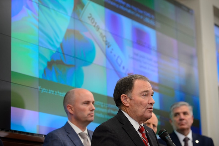 (Trent Nelson | The Salt Lake Tribune) Gov. Gary Herbert speaks at a news conference in the state's Emergency Operations Center on Thursday, March 12, 2020 addressing the current state of COVID-19 in Utah. Representatives from the Utah System of Higher Education, the Utah Board of Education, Utah Jazz, local health authorities and Utah Department of Health were also present.