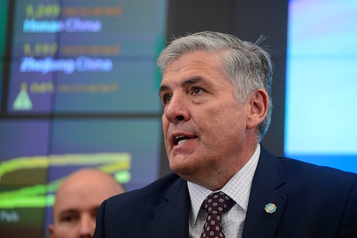 (Trent Nelson | The Salt Lake Tribune) Steve Starks, CEO, Larry H. Miller Group of Companies, speaks at a news conference in the state's Emergency Operations Center on Thursday, March 12, 2020 addressing the current state of COVID-19 in Utah. Representatives from the Utah System of Higher Education, the Utah Board of Education, Utah Jazz, local health authorities and Utah Department of Health were also present.