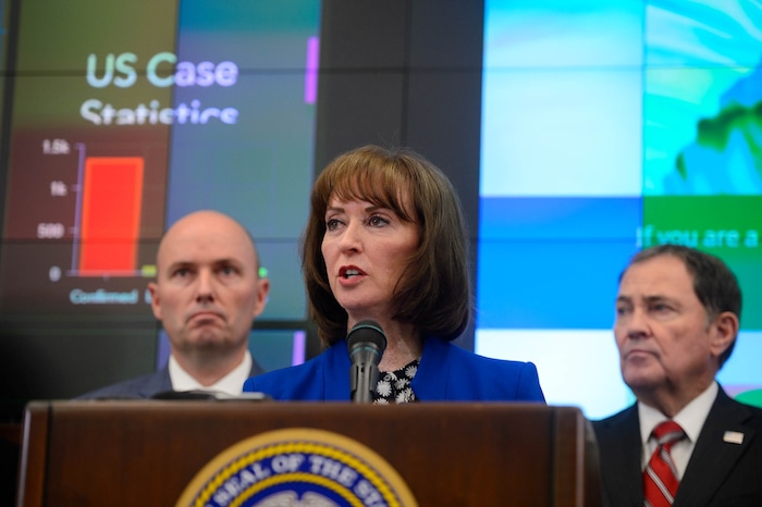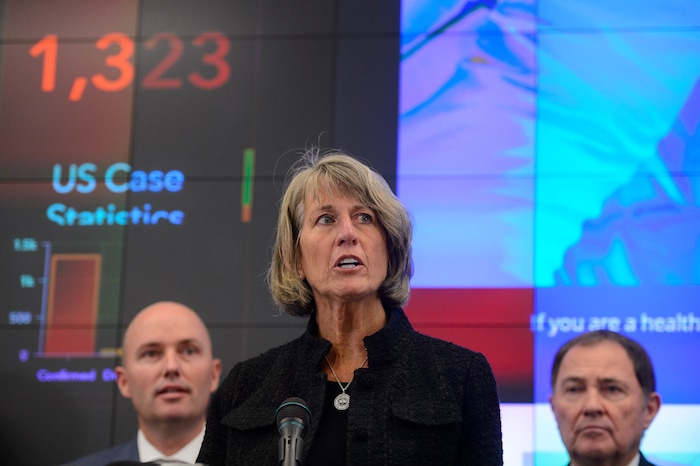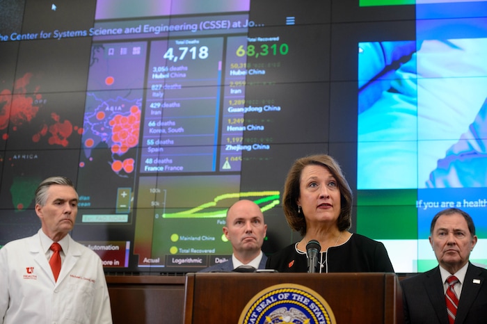 (Trent Nelson | The Salt Lake Tribune) Dr. Angela Dunn, Utah State Epidemiologist, speaks at a news conference in the state's Emergency Operations Center on Thursday, March 12, 2020 addressing the current state of COVID-19 in Utah. Representatives from the Utah System of Higher Education, the Utah Board of Education, Utah Jazz, local health authorities and Utah Department of Health were also present.
