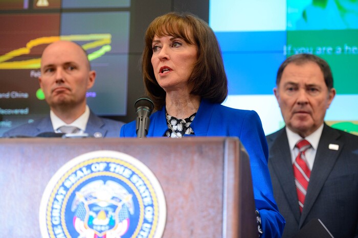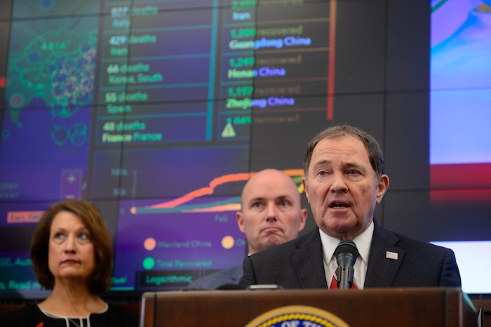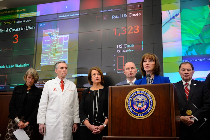 (Trent Nelson | Tribune file photo) Michael Good, Ruth Watkins, and David Woolstenhulme at a news conference in the state's Emergency Operations Center on Thursday, March 12, 2020 addressing the current state of COVID-19 in Utah.