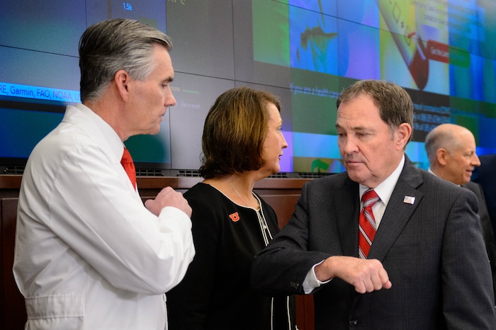 (Trent Nelson | The Salt Lake Tribune) Gov. Gary Herbert bumps elbows with Michael Good after a news conference in the state's Emergency Operations Center on Thursday, March 12, 2020 addressing the current state of COVID-19 in Utah. Representatives from the Utah System of Higher Education, the Utah Board of Education, Utah Jazz, local health authorities and Utah Department of Health were also present.