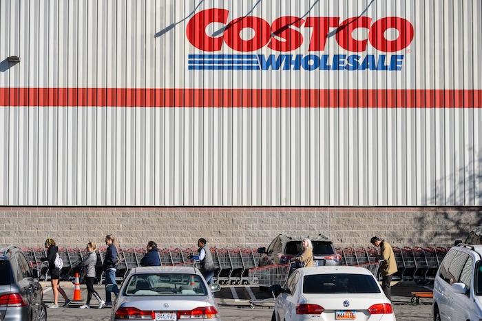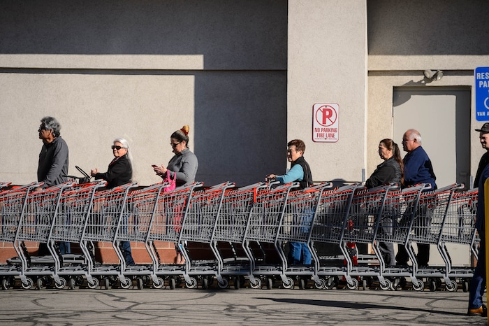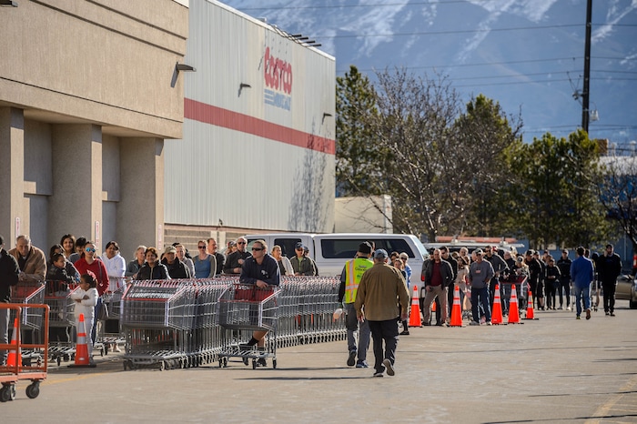 (Trent Nelson | The Salt Lake Tribune) Shoppers spaced out in line at the Salt Lake City Costco location on Monday, March 16, 2020.