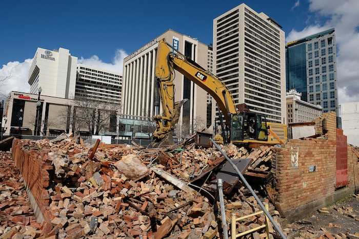 Crews take down the old Zephyr Club at 300 S. and West Temple in Salt Lake City on Thursday. Sources say the building had substantial roof damage, unrelated to the recent earthquake, and will be replaced for now with landscaping.