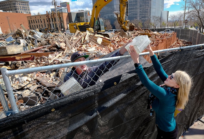 (Francisco Kjolseth | The Salt Lake Tribune) Michael Lund and Heather Johnson score a few souvenir glass blocks as crews take down the old Zephyr Club at 301 S. West Temple in Salt Lake City on Thursday, April 2, 2020. Sources say the building had substantial roof damage, unrelated to the recent earthquake, and will be replaced for now with landscaping.