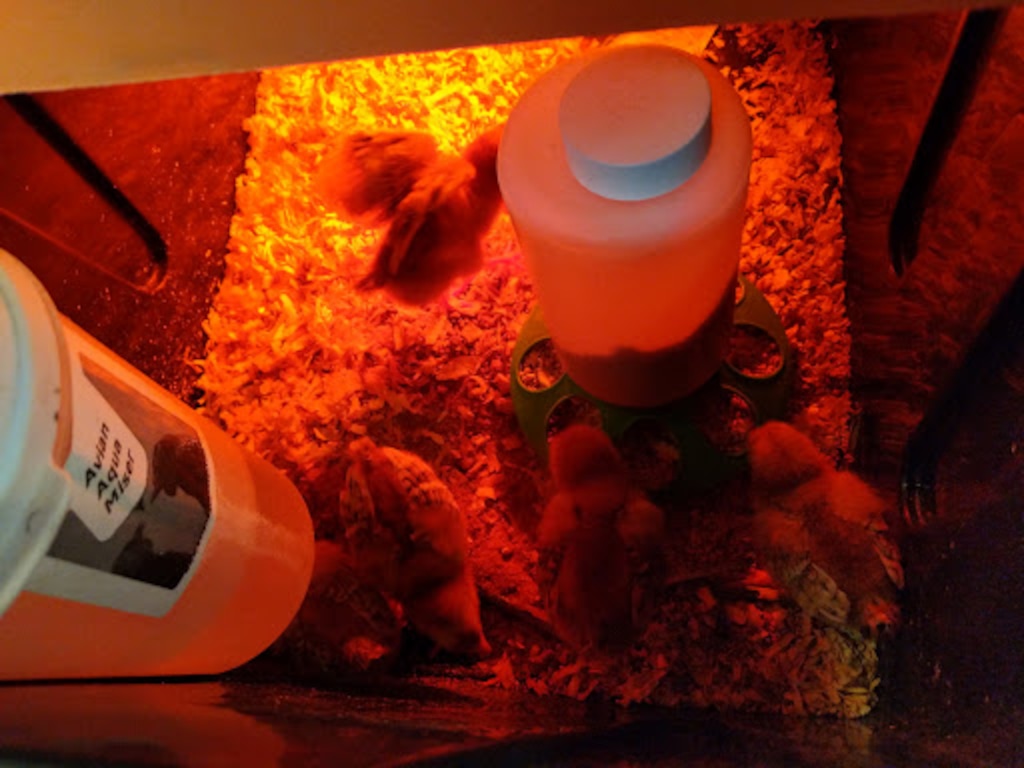 (Photo courtesy of Jonathan Morrison) Rhode Island Red chicks huddle in the corner of their enclosure under a heat lamp.