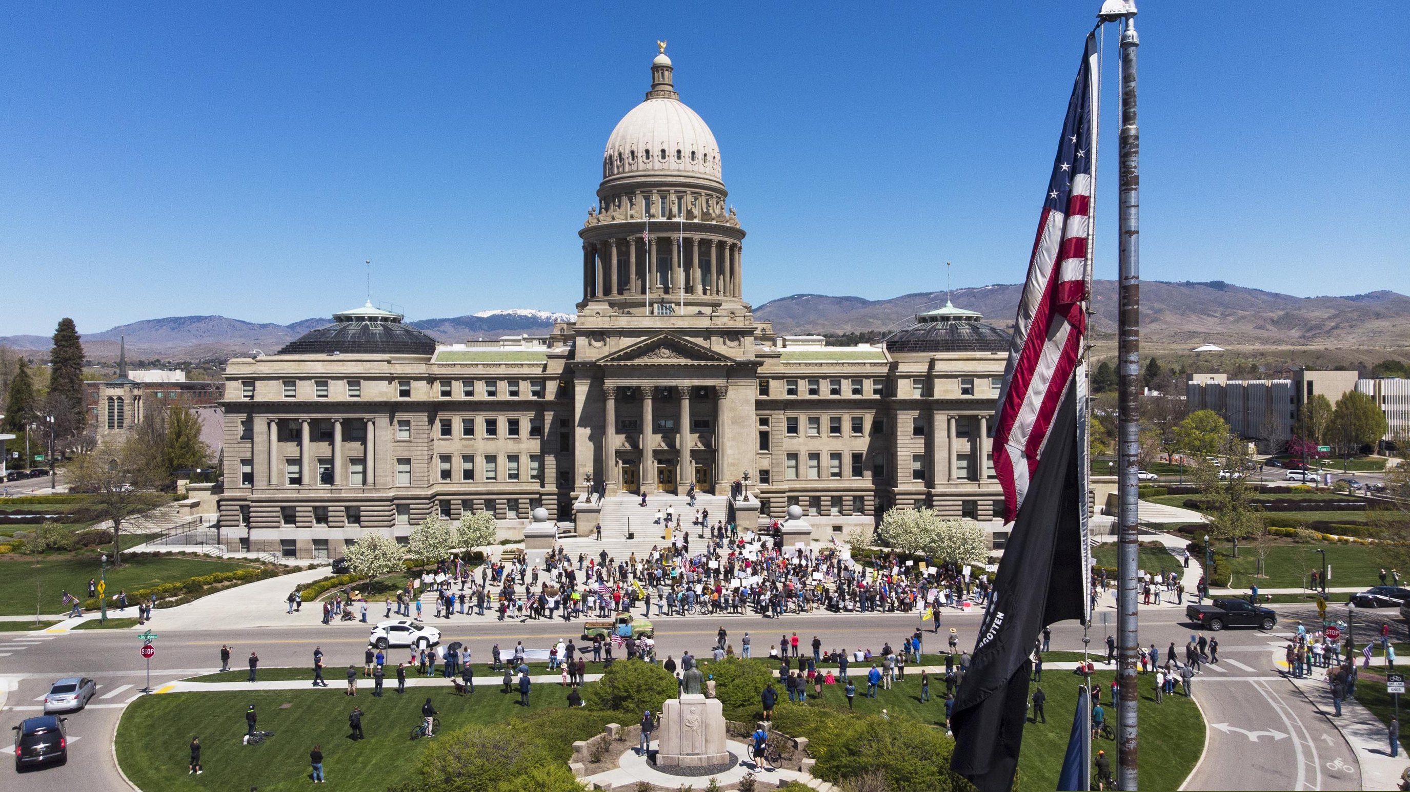 Boise, Idaho • More than 1,000 protesters gathered at the Idaho Statehouse Friday afternoon in defiance of Gov. Brad Little’s extension of the statewide stay-at-home order.