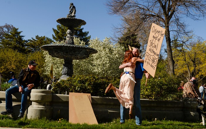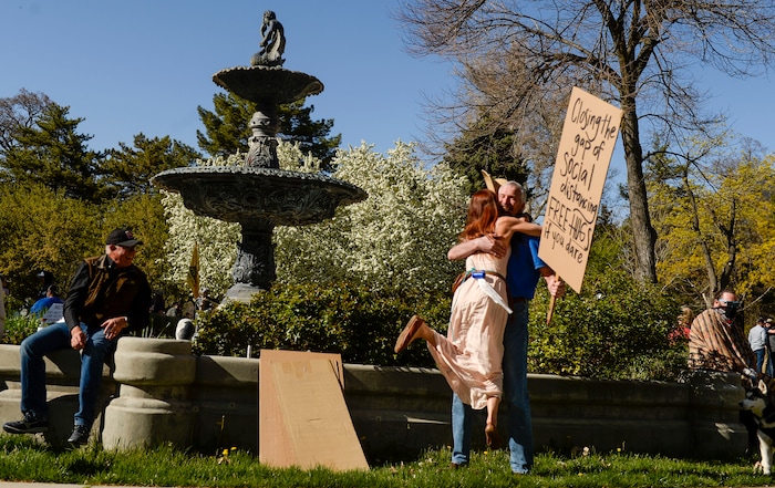 (Leah Hogsten | The Salt Lake Tribune) Aaron Davidson, holding a sign that read ÒClosing the gap of social distancing, free hugs if you dareÓ is almost knocked off his feet as Ksniya Kniazeva leaps into his arms. About 1,000 people protested the government mandated shutdown of businesses on the grounds of Salt Lake City Hall, Saturday. The protest was organized by Utah Business Revival aimed at Mayor Erin Mendenhall, Salt Lake County Mayor Jenny Wilsonand Governor Gary Herbert policies on COVID-19 and social distancing, April 18, 2020.