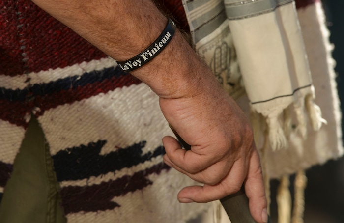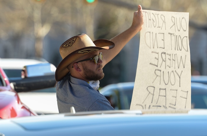 (Leah Hogsten | The Salt Lake Tribune) Brand Thorton wears a LaVoy Finicum bracelet in honor of the man who was a spokesman for the militia group Citizens for Constitutional Freedom, who was shot by law enforcement outside the Malheur National Wildlife Refuge. About 1,000 people protested the government mandated shutdown of businesses on the grounds of Salt Lake City Hall, Saturday. The protest was organized by Utah Business Revival aimed at Mayor Erin Mendenhall, Salt Lake County Mayor Jenny Wilsonand Governor Gary Herbert policies on COVID-19 and social distancing, April 18, 2020.