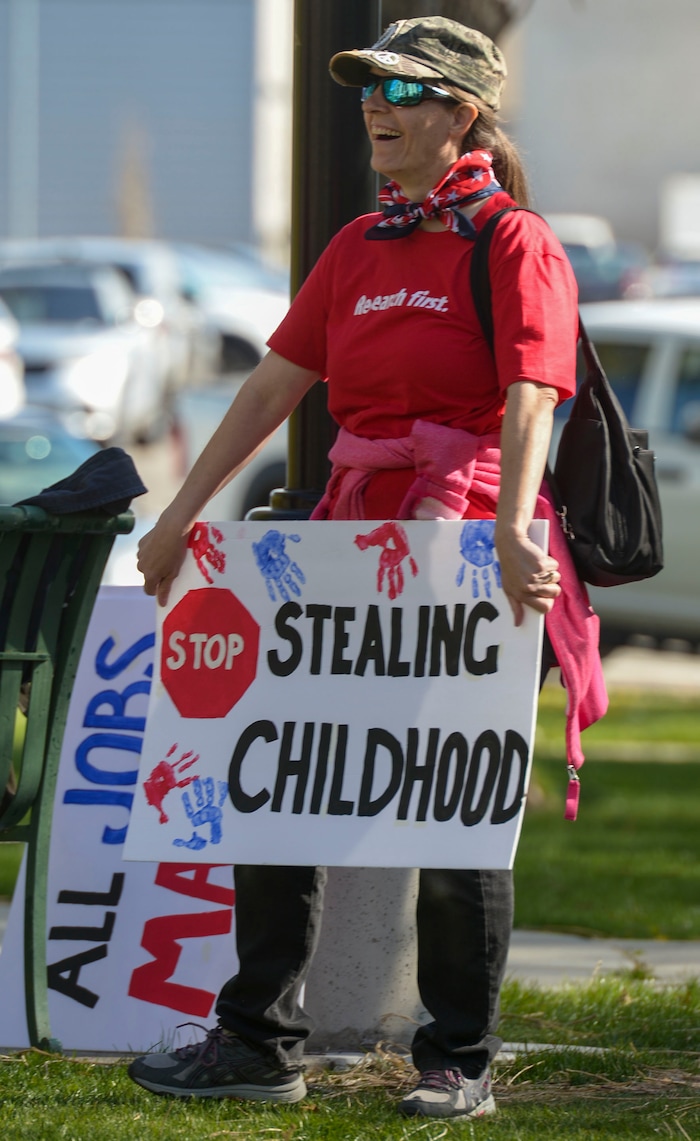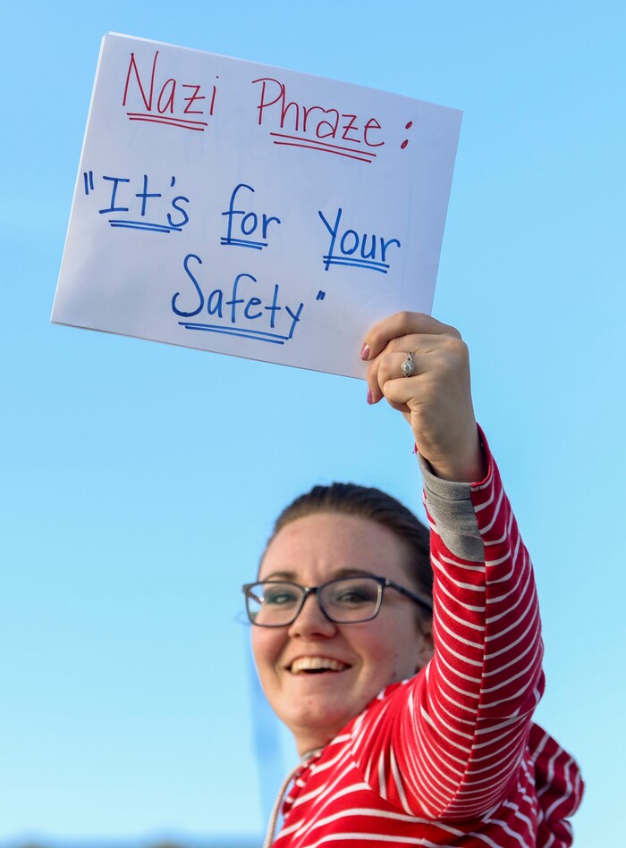 Rosie Moore, of Park City, is over 60. She came to the rally Saturday dressed in a star-spangled denim jacket and carrying a sign with a graph of Utah’s unemployment numbers. It proclaimed: “Flatten this curve."