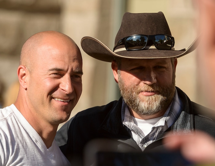 (Leah Hogsten | The Salt Lake Tribune) l-r Eric Moutsos, event organizer and Ammon Bundy pose for a photo. About 1,000 people protested the government mandated shutdown of businesses on the grounds of Salt Lake City Hall, Saturday. The protest was organized by Utah Business Revival aimed at Mayor Erin Mendenhall, Salt Lake County Mayor Jenny Wilsonand Governor Gary Herbert policies on COVID-19 and social distancing, April 18, 2020.
