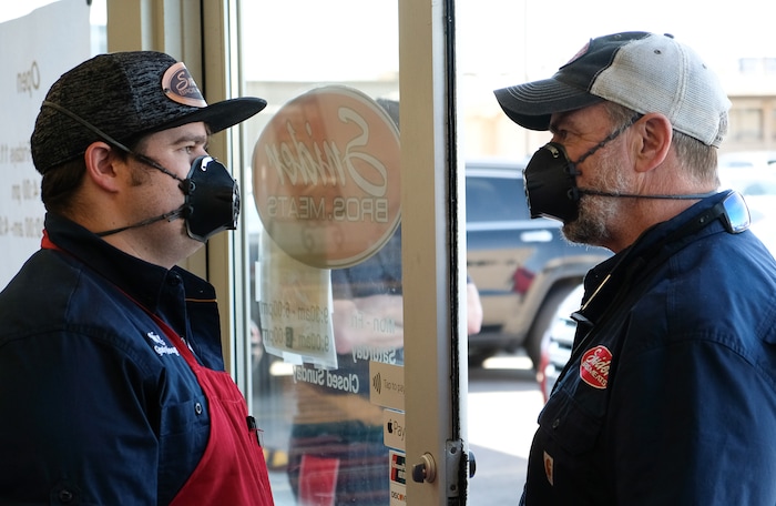 (Francisco Kjolseth | The Salt Lake Tribune) Snider Brothers Meats owners Will and Amy Wilson check in with one another at their store in Cottonwood Heights on Tuesday, May 5, 2020, as they open for the day to a steady stream of customers. Concerned over the well being of their staff they have been requiring that all customers wear masks or facial coverings when they come to shop. They say it's important to protect their employees, several of whom are the sole breadwinners in their families and have at-risk family members.