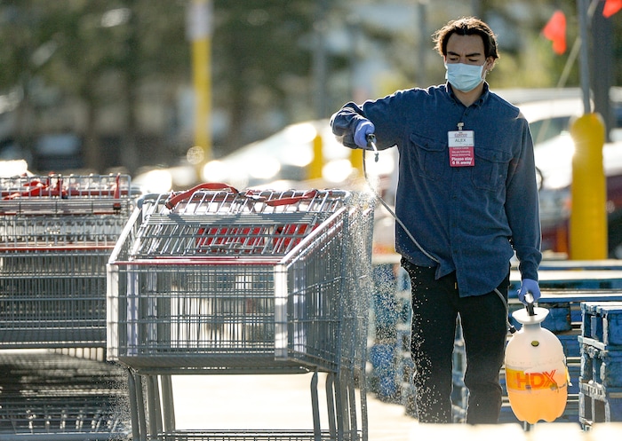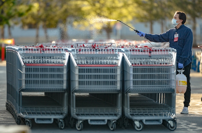(Francisco Kjolseth | The Salt Lake Tribune) Costco staff sanitize shopping carts as they begin implementing a policy on Monday, May 4, 2020, that everyone in the store, including shoppers, have to wear a mask.