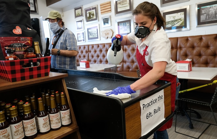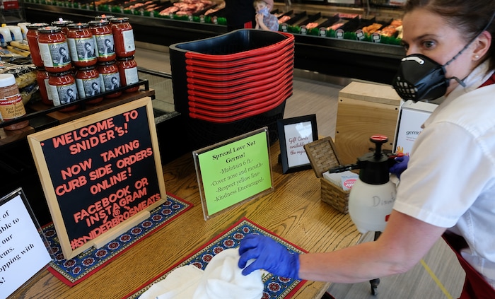 (Francisco Kjolseth | The Salt Lake Tribune) General Manager Jake Wilson does a regular surface cleaning as a steady stream of customers visits Snider Brothers Meats in Cottonwood Heights on Tuesday, May 5, 2020, where owners Will and Amy Wilson, have been requiring that all customers wear masks or facial coverings when they come to shop. They say it's important to protect their employees, several of whom are the sole breadwinners in their families and have at-risk family members.
