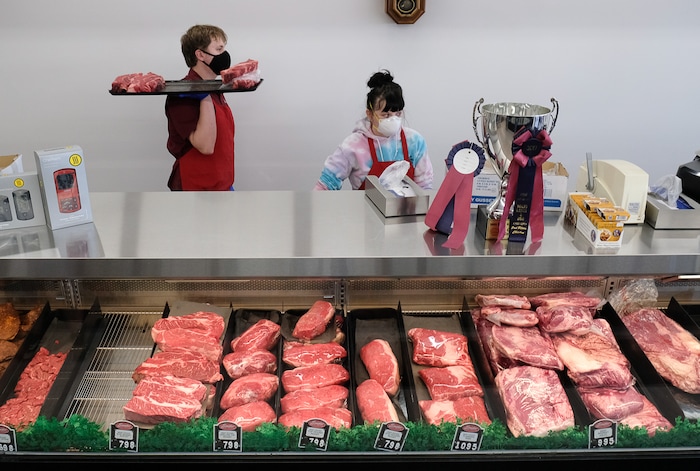 (Francisco Kjolseth | The Salt Lake Tribune) Todd Smith directs customers to meats available at Snider Brothers Meats in Cottonwood Heights on Tuesday, May 5, 2020.
