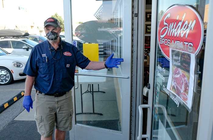 (Francisco Kjolseth | The Salt Lake Tribune) Will Wilson, co-owner of Snider Brothers Meats in Cottonwood Heights controls the flow of customers to his store on Tuesday, May 5, 2020, where he has been requiring that all customers wear masks or facial coverings when they come to shop due to the coronavirus pandemic.