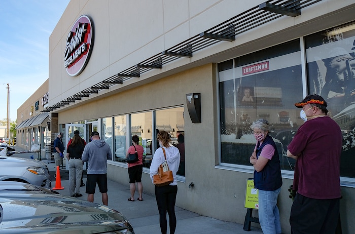 (Francisco Kjolseth | The Salt Lake Tribune) People line up outside of Snider Brothers Meats in Cottonwood Heights on Tuesday, May 5, 2020, as they limit the number of people inside the store.