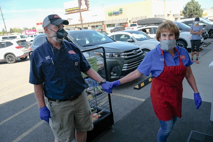 (Francisco Kjolseth | The Salt Lake Tribune) Customer Richard Christensen picks up an order at Snider Brothers Meats in Cottonwood Heights on Tuesday, May 5, 2020, where owners Will and Amy Wilson, have been requiring that all customers wear masks or facial coverings when they come to shop.