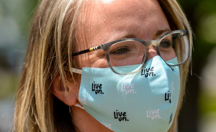 (Leah Hogsten | The Salt Lake Tribune) Kim Myers assistant director of Utah Division of Substance Abuse and Mental Health shows off her Live On mask to promote a 3-year campaign to bump up education, provide resources, and change the culture around suicide and mental health Thursday. The statewide campaign, Live On, is a statewide effort to help Utahns struggling with isolation, job loss and increased stress and anxiety surrounding COVID-19.