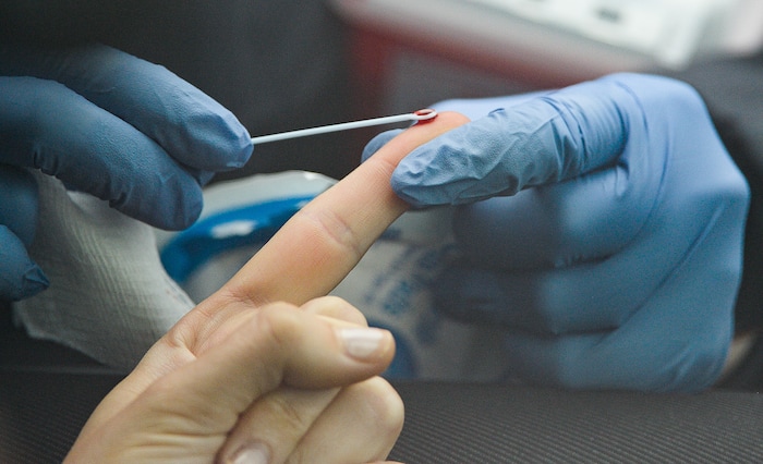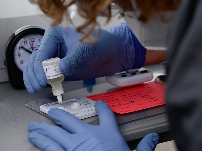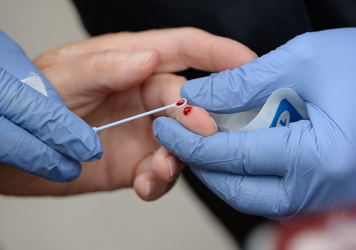 Jordan Eickbrush, a registered nurse, waited for DeLoach to roll down her window and then stuck DeLoach’s finger, drawing some blood. Eickbush put that in a vial with some solution. It sits there for five minutes and then is transferred into another solution for 10 minutes. After that, it should produce results.
