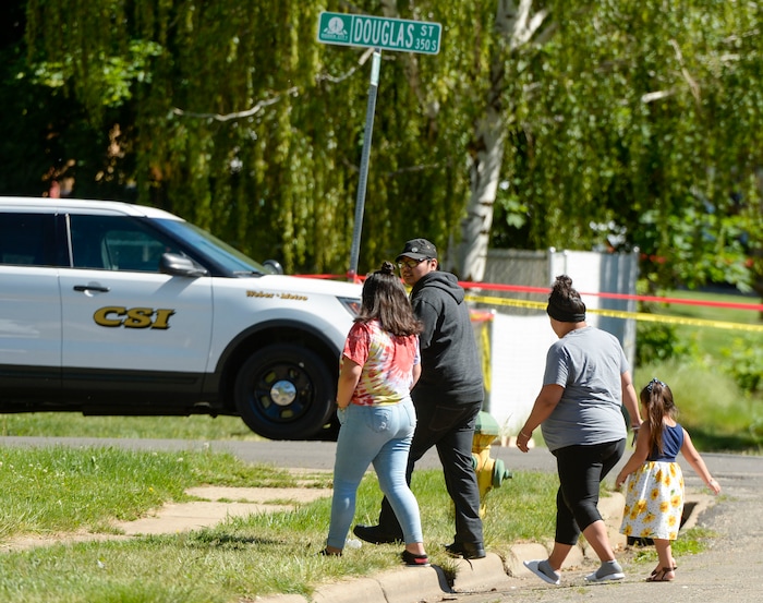 (Leah Hogsten | The Salt Lake Tribune) Jackson Avenue home owners walk the neighborhood to their cars parked elsewhere as Ogden Police Department crime scene investigators work the scene on Thursday. An Ogden police officer died in a shooting after responding to a domestic violence call May 28, 2020 in the area of Jackson Avenue and Harrop Street shortly after noon. A suspect was killed and an officer with Adult Probation and Parole was injured at the scene.