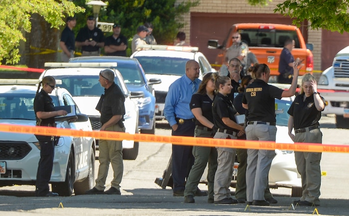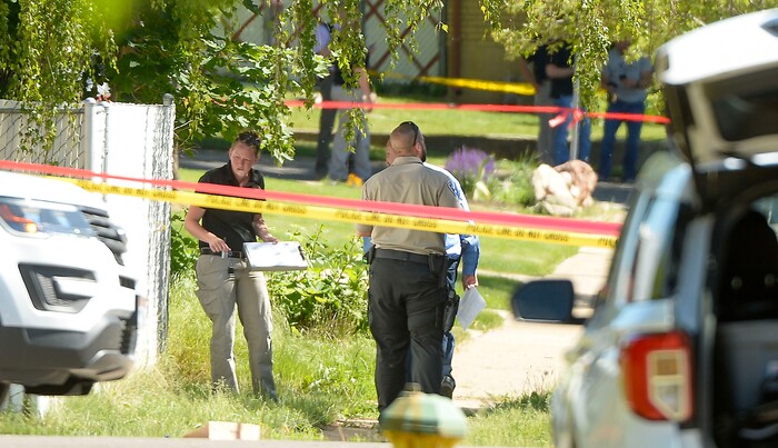 (Leah Hogsten | The Salt Lake Tribune) Ogden Police Department crime scene investigators work the scene on Jackson Avenue on Thursday. An Ogden police officer died in a shooting after responding to a domestic violence call May 28, 2020 in the area of Jackson Avenue and Harrop Street shortly after noon. A suspect was killed and an officer with Adult Probation and Parole was injured at the scene.