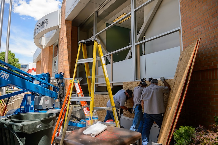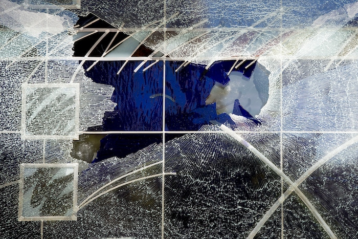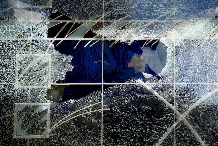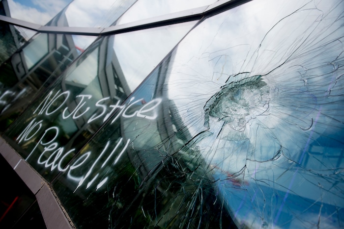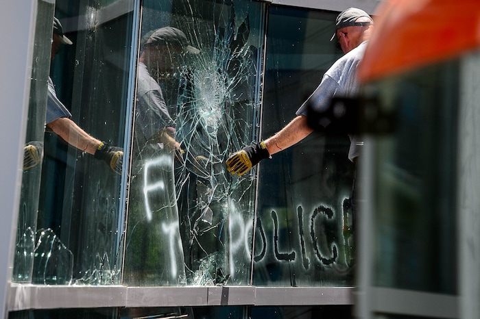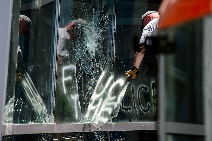 (Jeremy Harmon | The Salt Lake Tribune) A window is damaged at the Public Safety Building in Salt Lake City on Sunday, May 31, 2020.