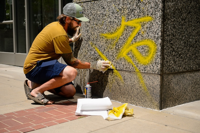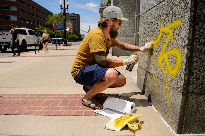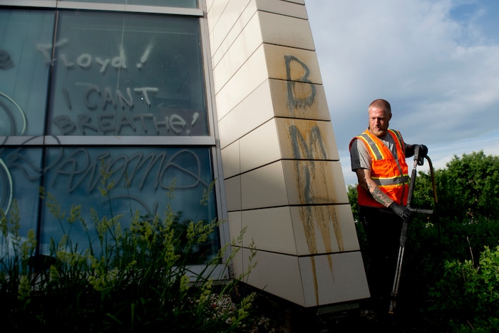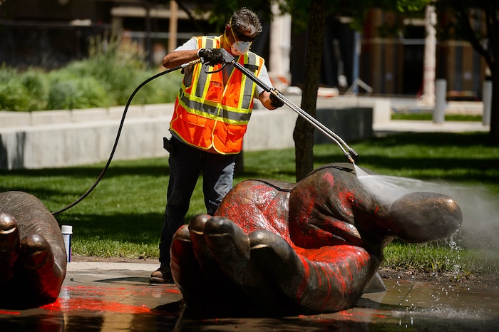 (Jeremy Harmon | The Salt Lake Tribune) Don Gamble cleans up graffiti at the Capitol in Salt Lake City on Sunday, May 31, 2020.