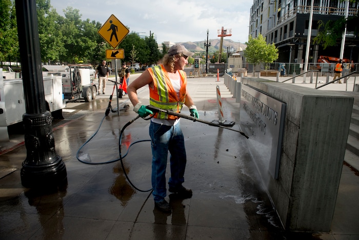 The state had volunteers and employees out Sunday scrubbing the Utah Capitol, which got pasted in places with graffiti.
