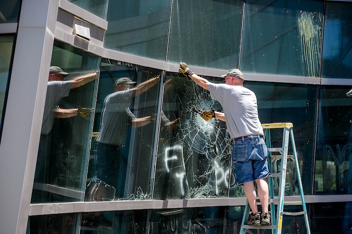 Salt Lake City has a graffiti-abatement program that sends city workers or contractors to remove spray paint and other markings. Mendenhall said it will be used to help clean public and private buildings sullied in Saturday’s protests.