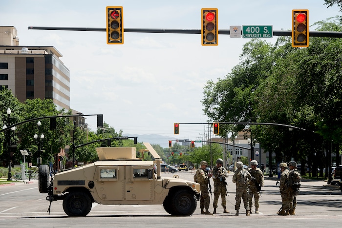 (Jeremy Harmon | The Salt Lake Tribune) National Guard troops block the intersection at 200 East 400 South in Salt Lake City on Sunday, May 31, 2020.