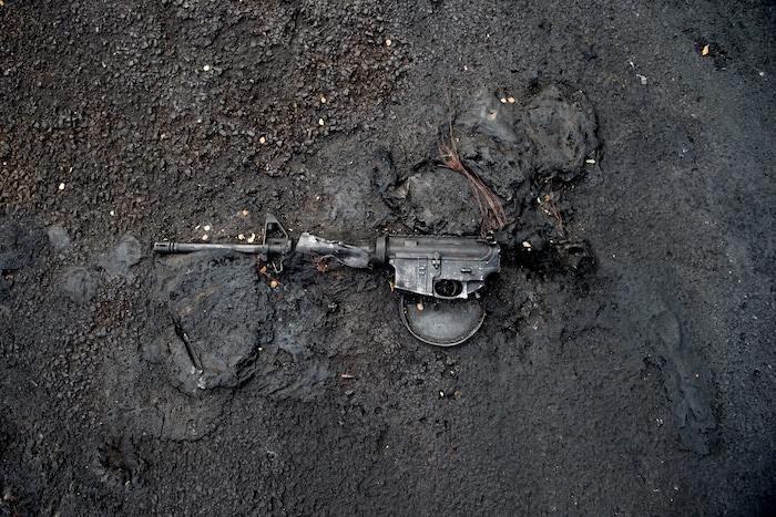 (Jeremy Harmon | The Salt Lake Tribune) A rifle is melted into the pavement where a police car was also burned outside the downtown library in Salt Lake City. Sunday, May 31, 2020.