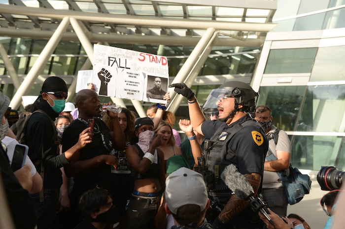 In one interaction, a protester singled out a police officer, saying he “proactively speaks out against police brutality,” and members of the crowd applauded.