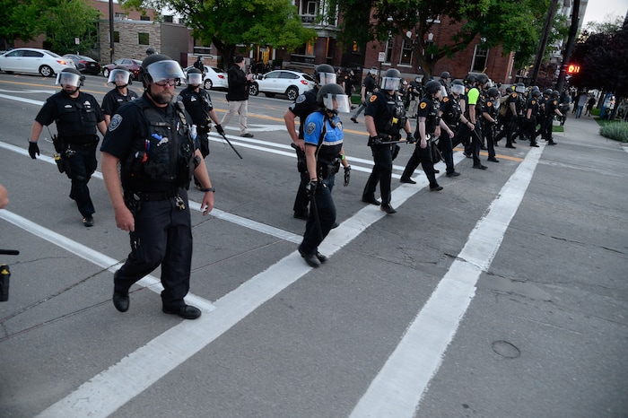 (Francisco Kjolseth | The Salt Lake Tribune) Police line up to enforce a mandatory curfew in Salt Lake City on Monday, June 1, 2020, as they get ready to push forward along 300 East near the downtown library following violence and unrest over the weekend due to the death of George Floyd by police.
